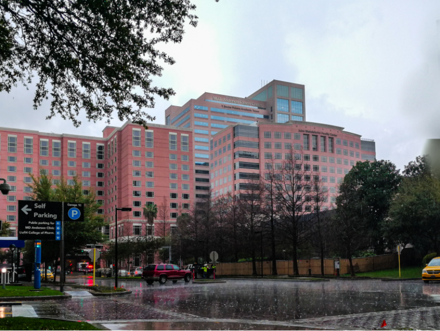 Figure 1The office building and patient-dedicated hotel of MD Anderson Cancer Center in the spring rain