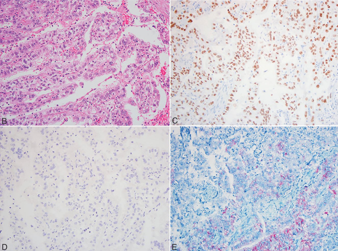 Compared to classic RCC, translocation-associated RCC has multiple relatively unique morphological patterns within the same tumor, including papillary architecture, clear cytoplasm, high nuclear grade, psammoma bodies, and sometimes rosette formation. Unlike clear cell RCC or papillary RCC, translocation-associated RCC is typically positive forPax–8but usually negative for CA-IX and/or AMACR. Additionally, although clear cell RCC may rarely express weak Melan-A, a small subset of translocation-associated carcinomas can be positive for Melan-A or HMB-45, which is uncommon in other types of RCC. In such cases, TFE3 immunohistochemistry should be added (Figure 3, B to E). However, the TFE3 antibody is technically challenging to work with, having significant background staining and poor specificity.