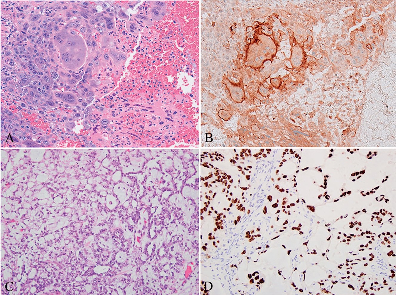Most markers used to evaluate testicular germ cell tumors have some degree of overlapping expression ranges (Table 2). Seminomas and intratubular germ cell neoplasia are generally positive for CD117, and most germ cell tumors express OCT4. Embryonal carcinoma is positive for CD30 and OCT4. Both seminoma and embryonal carcinoma can express D2-40, but they show different staining patterns: seminoma exhibits diffuse membranous D2-40 staining, while embryonal carcinoma shows focal lacelike D2-40 staining (Figure 4). Yolk sac components express AFP and Glypican-3. Glypican-3 is also expressed in trophoblastic cells. Choriocarcinoma is positive for β-hCG (beta subunit of human chorionic gonadotropin; Figure 4, A and B). A small subset of seminomas may secrete β-hCG or contain syncytiotrophoblast cells secreting β-hCG, which should not be misdiagnosed as choriocarcinoma.