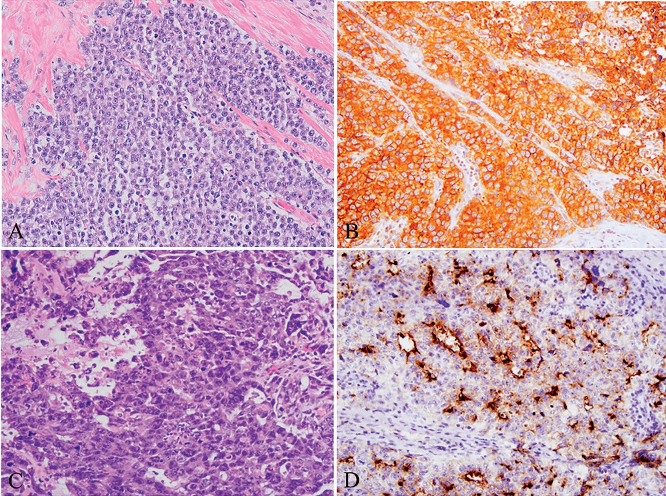 Most markers used to evaluate testicular germ cell tumors have some degree of overlapping expression ranges (Table 2). Seminomas and intratubular germ cell neoplasia are generally positive for CD117, and most germ cell tumors express OCT4. Embryonal carcinoma is positive for CD30 and OCT4. Both seminoma and embryonal carcinoma can express D2-40, but they show different staining patterns: seminoma exhibits diffuse membranous D2-40 staining, while embryonal carcinoma shows focal lacelike D2-40 staining (Figure 4). Yolk sac components express AFP and Glypican-3. Glypican-3 is also expressed in trophoblastic cells. Choriocarcinoma is positive for β-hCG (beta subunit of human chorionic gonadotropin; Figure 4, A and B). A small subset of seminomas may secrete β-hCG or contain syncytiotrophoblast cells secreting β-hCG, which should not be misdiagnosed as choriocarcinoma.