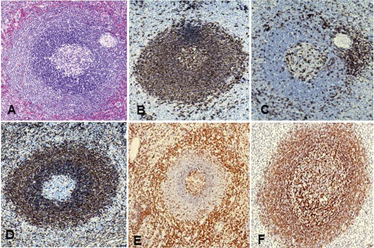 Splenic lymphoid follicles are mainly composed of B cells, with scattered small numbers of CD4+ T lymphocytes. Lymphoid follicles are divided into primary and secondary follicles. Primary follicles consist of mature B cells expressing standard B lymphocyte markers (CD19, CD20, CD79a, PAX5, and BCL2). Secondary follicles consist of germinal centers containing B cells and occasional T lymphocytes, surrounded by a mantle zone with follicular dendritic cells. Germinal center B lymphocytes express CD19, CD20, CD79a, PAX5, CD10, and BCL6, and express immunoglobulins IgM and IgD. However, they are negative for BCL2 expression. Mantle zone B lymphocytes express CD19, CD20, CD5, DBA.44, BCL2, and IgD, but are negative for CD10 and CD23. Follicular dendritic cells forming the follicular network express follicular dendritic cell markers such as CD21 and CD35.