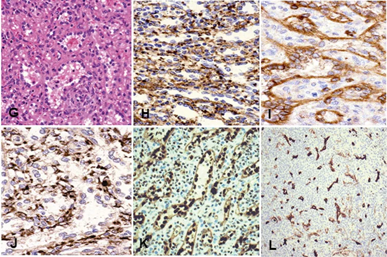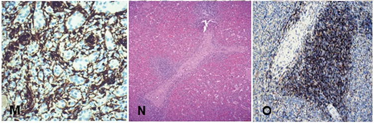 There are clear advantages and disadvantages among vascular markers. ERG is a newer marker with multiple advantages, including nuclear localization (easier interpretation); extremely high staining intensity and sensitivity (essentially all vascular endothelial and vascular tumors are positive). WT1 is also an excellent vascular marker with high sensitivity, clean background staining, and cytoplasmic staining, staining most vascular endothelial and vascular tumors. CD34 is a very good vascular marker, but when used for the spleen, it cannot distinguish splenic littoral cells (e.g., red pulp sinuses), vascular hyperplasia (e.g., hamartoma), or tumors derived from littoral cells (littoral cell angioma). Although CD34 can be expressed in poorly differentiated vascular tumors, most cases are negative. CD31 is sensitive to vascular endothelium but not specific, as it also stains macrophages (Table 2). Factor VIII has moderate sensitivity and specificity (Figure 1, A to O).