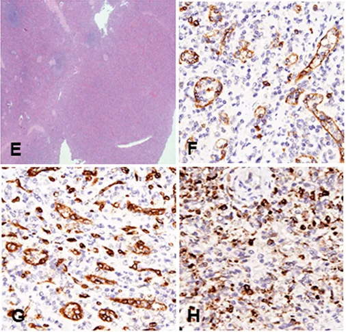 Splenic hamartoma is also unique to the spleen, with the lesion composed solely of red pulp, microscopically showing abundant red pulp without white pulp structures. On cut section, splenic hamartoma often protrudes from the surface to form a nodular mass pushing against adjacent normal spleen. Splenic hamartoma lacks a capsule but usually has a clear boundary with adjacent normal spleen. Structurally, it consists of various organized cords and sinus-like structures. The sinus lining cells are CD8 positive and also immunoreactive to general vascular endothelial markers (ERG, WT1, CD31, and Factor VIII). Additionally, they can show focal positivity for histiocytic markers (Figure 2, A to P).