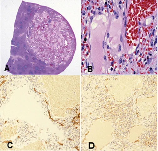 Littoral cell angioma is a relatively rare vascular tumor found only in the spleen, believed to arise from red pulp sinus endothelial (littoral) cells. This tumor is located within the red pulp and consists of multiple irregular cystic lumens filled with blood. It may be multifocal and is most often discovered during abdominal imaging. The lumens are lined by tall columnar and flattened red pulp-derived cells that protrude into the vascular lumen. The tall columnar lining cells express histiocytic markers (CD68 and CD163), while the flattened cells express vascular markers (CD31 and Factor VIII). These tumors also express ERG but usually do not express WT1 and CD34. Compared to normal splenic littoral cells, littoral cell angioma does not express CD8. The co-expression of histiocytic and vascular markers is a distinctive feature of littoral cell angioma and can be used for differential diagnosis.