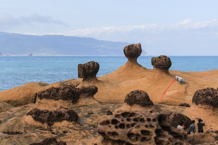 | The geological layers in this area are formed by the accumulation of sandstone. Influenced by orogenic movements, sedimentary rocks buried deep under the sea rose to the surface, creating nearby coastal features such as cuestas, sea cliffs, and sea caves. After long-term erosion and weathering by waves, steep sea cliffs and wide, flat rock beds formed along the coast. The beach is densely covered with strange rocks and stones—honeycomb rocks, tofu rocks, mushroom rocks, ginger rocks—some resembling humans, some animals, and some objects. Viewed from above, they look like clusters of black mushrooms drying on the sand, making one marvel at the wonders of nature’s craftsmanship. |