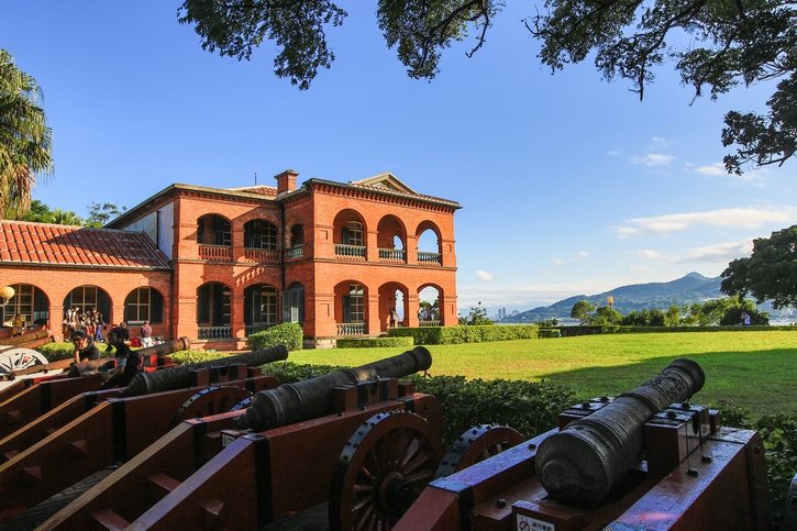 | The four old-style discarded cannons outside the fort and the aging red building create an exquisite atmosphere that has long solidified into an indelible mark of Tamsui’s history. |