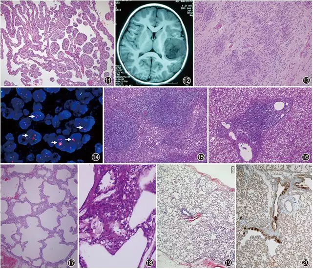 FLIT is a recently recognized solitary, congenital benign space-occupying lesion of the lung, composed of immature airways and stroma, lined by flat or cuboidal epithelium, with underlying bland immature mesenchymal cells. This disease is extremely rare, with less than 15 cases reported in the literature to date. Clinically may be asymptomatic, only discovered by routine prenatal ultrasound; or the infant may present with respiratory distress, feeding difficulties, etc., with or without fever. Most have no specific positive laboratory findings; may have decreased oxygen partial pressure due to hypoxia. Imaging shows a solitary, well-defined mass confined to one lung lobe, solid or cystic-solid (Figure 10). Microscopic examination shows the tumor is well-demarcated from surrounding normal lung tissue, with a fibrous capsule. The tumor consists of variably sized alveolar-like cystic spaces, some of which merge with tubular structures (resembling terminal respiratory bronchioles and alveolar ducts). Cyst walls are lined by flat or cuboidal epithelial cells with pale cytoplasm, bland nuclei without significant atypia. Septa between cysts are widened; stromal cells are oval, polygonal, or spindle-shaped, with abundant clear cytoplasm, round or oval nuclei, fine chromatin (Figure 11). The surface lining epithelial cells are positive for CK, EMA, thyroid transcription factor (TTF)1, and β-catenin. Stromal cells are positive for vimentin, SMA, β-catenin (cytoplasmic staining), Ki-67 labeling index 5%-10%. Desmin, CD34, synaptophysin, HMB45, anaplastic lymphoma kinase (ALK), S-100 protein, CD56, CD30, etc. are negative. FISH detection reveals ALK gene rearrangement in some FLIT cases.